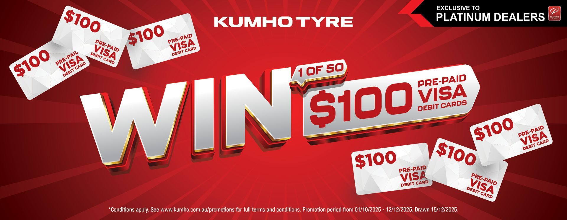 Kumho tyres and register online, you’ll go into the draw to win one of 50 x $100 prepaid Visa gift cards*. That’s extra spending money, just in time for gifts, getaways, or treating yourself!
